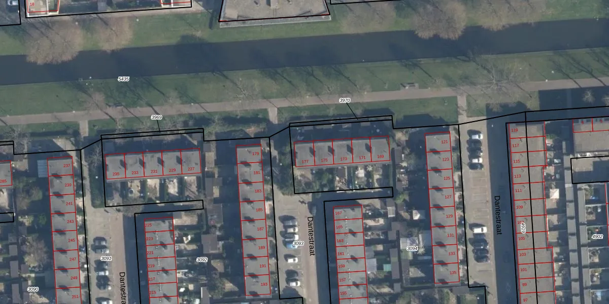Het perceel waarop Dantestraat 177 staat heeft een oppervlakte van 3922 m². Dit is een zeer groot perceel. De perceeloppervlakte wordt geregistreerd door het Kadaster. Gedetailleerde informatie over de maten van dit perceel kunt u vinden in het rapport Kadastrale kaart met maatvoering van Dantestraat 177.