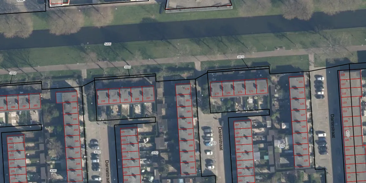 Het perceel waarop Dantestraat 179 staat heeft een oppervlakte van 3980 m². Dit is een zeer groot perceel. De perceeloppervlakte wordt geregistreerd door het Kadaster. Gedetailleerde informatie over de maten van dit perceel kunt u vinden in het rapport Kadastrale kaart met maatvoering van Dantestraat 179.
