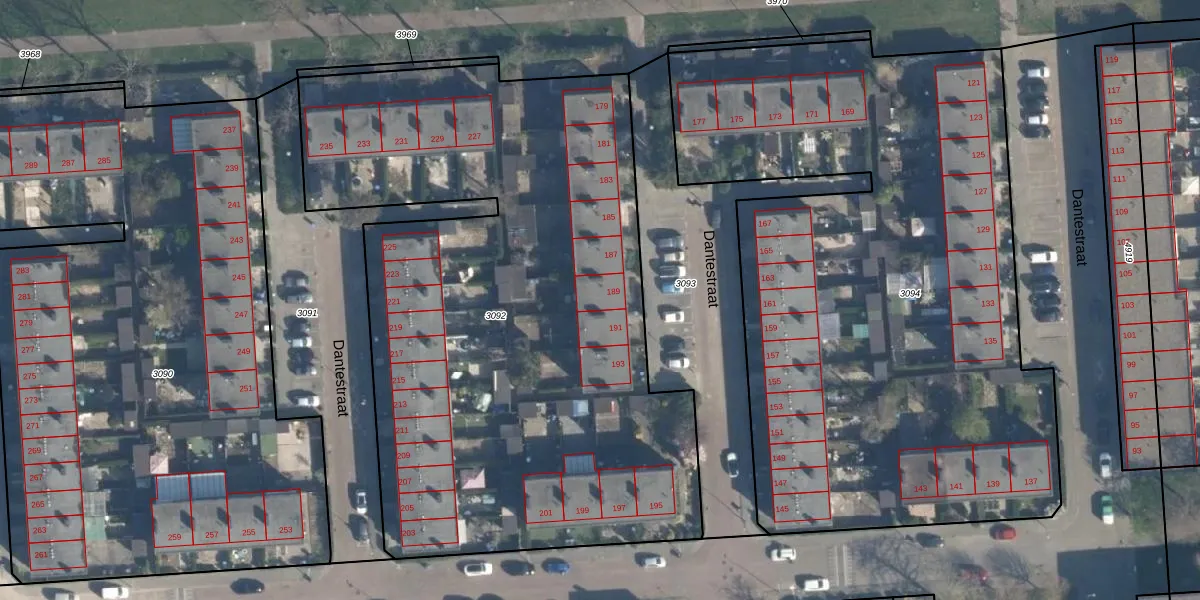 Het perceel waarop Dantestraat 189 staat heeft een oppervlakte van 3980 m². Dit is een zeer groot perceel. De perceeloppervlakte wordt geregistreerd door het Kadaster. Gedetailleerde informatie over de maten van dit perceel kunt u vinden in het rapport Kadastrale kaart met maatvoering van Dantestraat 189.