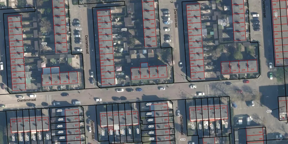 Het perceel waarop Dantestraat 199 staat heeft een oppervlakte van 3980 m². Dit is een zeer groot perceel. De perceeloppervlakte wordt geregistreerd door het Kadaster. Gedetailleerde informatie over de maten van dit perceel kunt u vinden in het rapport Kadastrale kaart met maatvoering van Dantestraat 199.