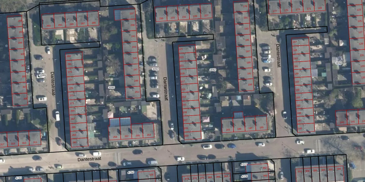 Het perceel waarop Dantestraat 215 staat heeft een oppervlakte van 3980 m². Dit is een zeer groot perceel. De perceeloppervlakte wordt geregistreerd door het Kadaster. Gedetailleerde informatie over de maten van dit perceel kunt u vinden in het rapport Kadastrale kaart met maatvoering van Dantestraat 215.