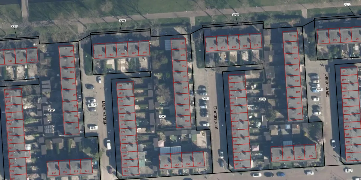 Het perceel waarop Dantestraat 245 staat heeft een oppervlakte van 3979 m². Dit is een zeer groot perceel. De perceeloppervlakte wordt geregistreerd door het Kadaster. Gedetailleerde informatie over de maten van dit perceel kunt u vinden in het rapport Kadastrale kaart met maatvoering van Dantestraat 245.