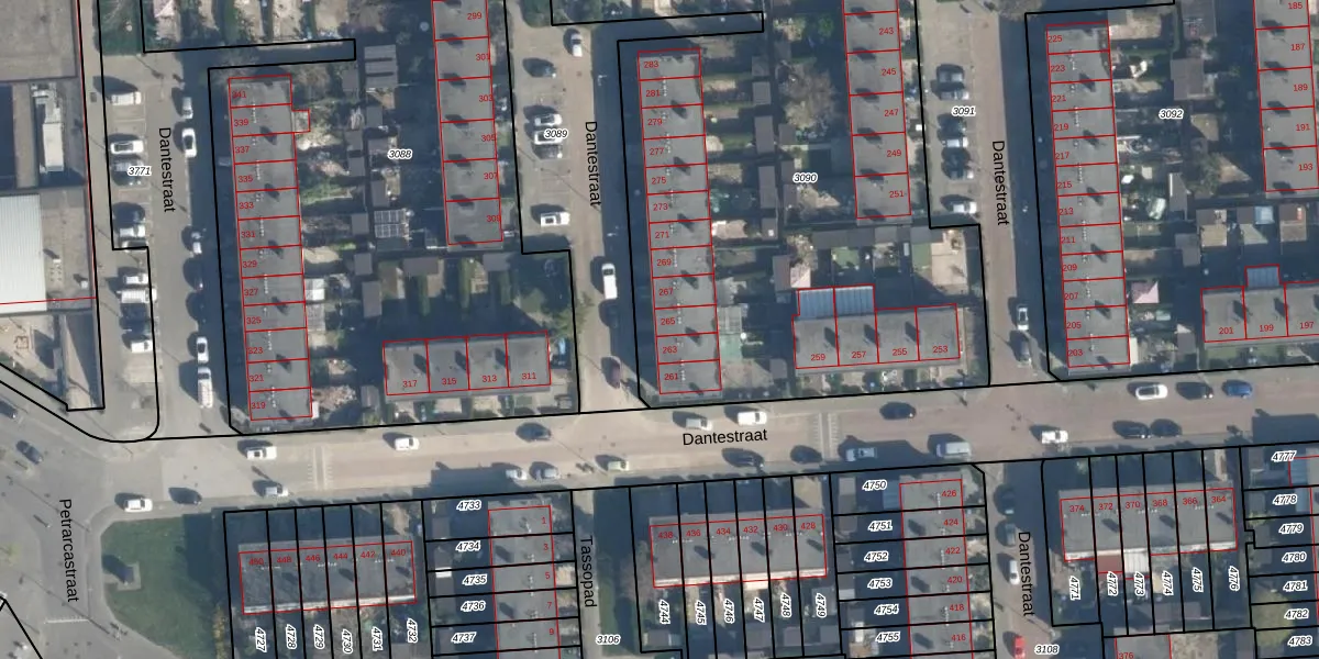 Het perceel waarop Dantestraat 265 staat heeft een oppervlakte van 3979 m². Dit is een zeer groot perceel. De perceeloppervlakte wordt geregistreerd door het Kadaster. Gedetailleerde informatie over de maten van dit perceel kunt u vinden in het rapport Kadastrale kaart met maatvoering van Dantestraat 265.