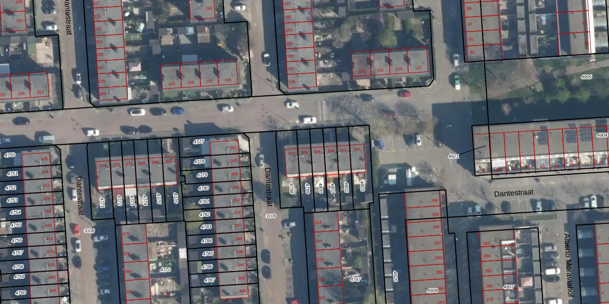 Het perceel waarop Dantestraat 308 staat heeft een oppervlakte van 119 m². Dit is een middelgroot perceel. De perceeloppervlakte wordt geregistreerd door het Kadaster. Gedetailleerde informatie over de maten van dit perceel kunt u vinden in het rapport Kadastrale kaart met maatvoering van Dantestraat 308.