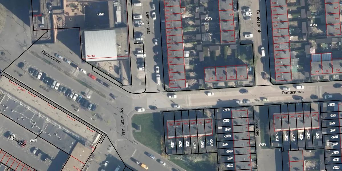 Het perceel waarop Dantestraat 319 staat heeft een oppervlakte van 3976 m². Dit is een zeer groot perceel. De perceeloppervlakte wordt geregistreerd door het Kadaster. Gedetailleerde informatie over de maten van dit perceel kunt u vinden in het rapport Kadastrale kaart met maatvoering van Dantestraat 319.