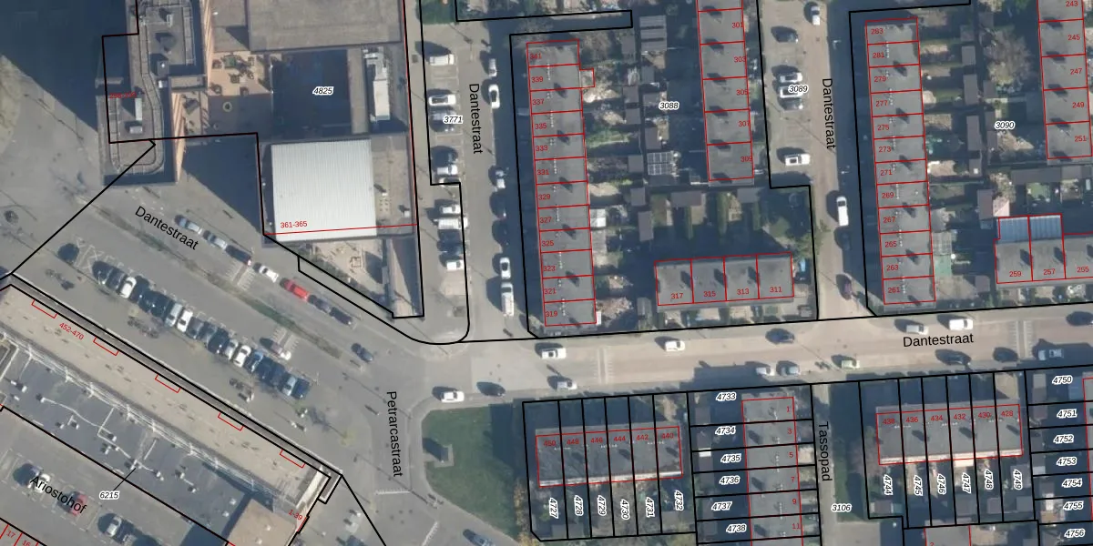 Het perceel waarop Dantestraat 323 staat heeft een oppervlakte van 3976 m². Dit is een zeer groot perceel. De perceeloppervlakte wordt geregistreerd door het Kadaster. Gedetailleerde informatie over de maten van dit perceel kunt u vinden in het rapport Kadastrale kaart met maatvoering van Dantestraat 323.
