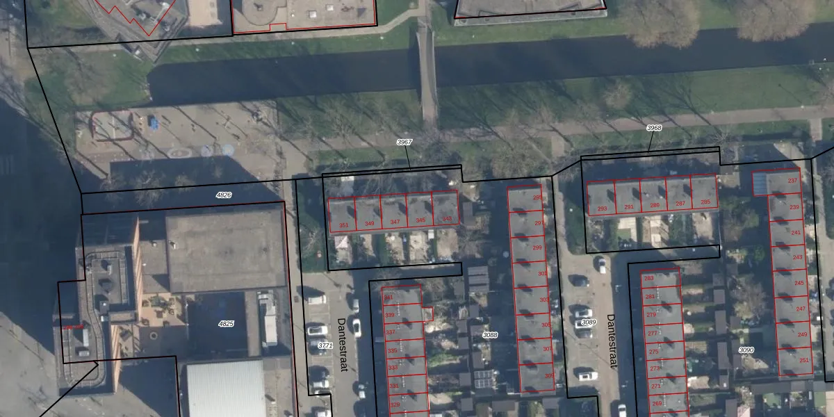 Het perceel waarop Dantestraat 345 staat heeft een oppervlakte van 3976 m². Dit is een zeer groot perceel. De perceeloppervlakte wordt geregistreerd door het Kadaster. Gedetailleerde informatie over de maten van dit perceel kunt u vinden in het rapport Kadastrale kaart met maatvoering van Dantestraat 345.