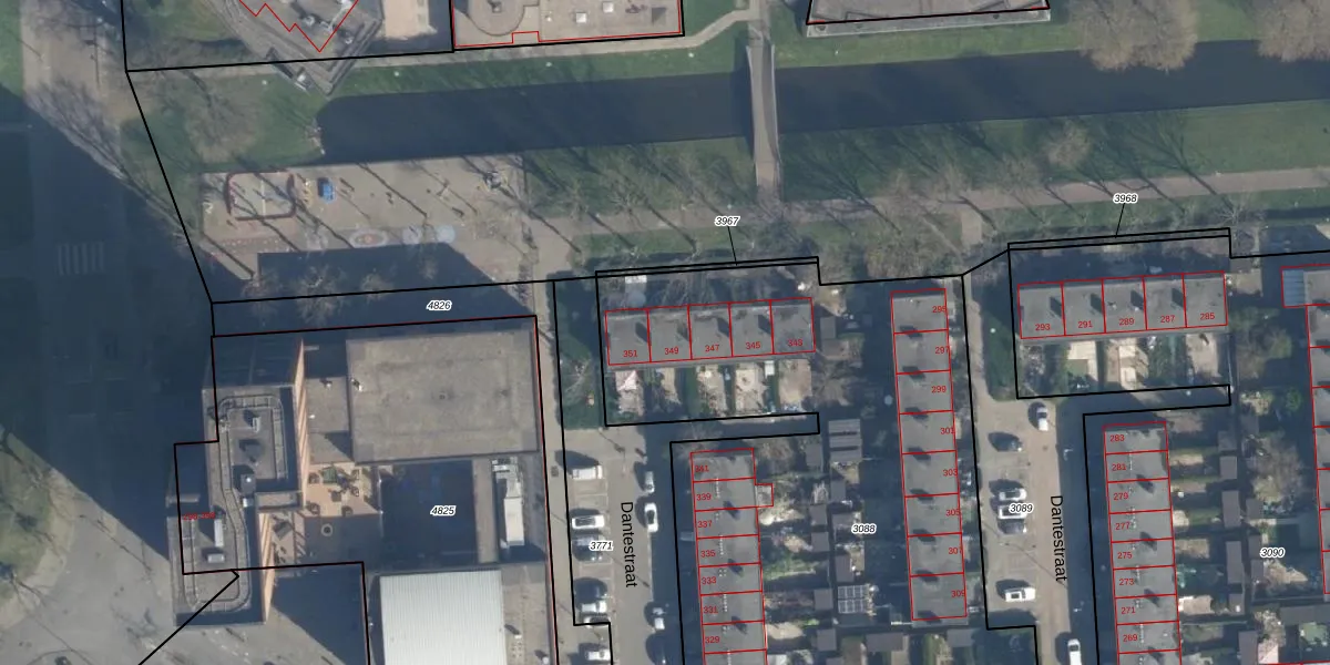 Het perceel waarop Dantestraat 349 staat heeft een oppervlakte van 3976 m². Dit is een zeer groot perceel. De perceeloppervlakte wordt geregistreerd door het Kadaster. Gedetailleerde informatie over de maten van dit perceel kunt u vinden in het rapport Kadastrale kaart met maatvoering van Dantestraat 349.