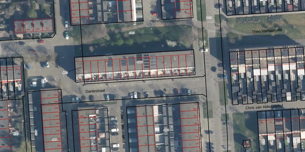 Dantestraat 71 is gelegen op kadastraal perceel ISM01C4904. Deze kadastrale aanduiding is uniek en wordt gebruikt door het Kadaster om eigendomsrechten en andere zakelijke rechten vast te leggen. Het perceel maakt onderdeel uit van de kadastrale gemeente IJsselmonde.