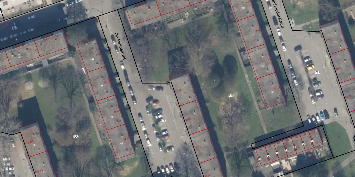 De Pintostraat 16 is gelegen op kadastraal perceel SBK01D722. Deze kadastrale aanduiding is uniek en wordt gebruikt door het Kadaster om eigendomsrechten en andere zakelijke rechten vast te leggen. Het perceel maakt onderdeel uit van de kadastrale gemeente Schiebroek.