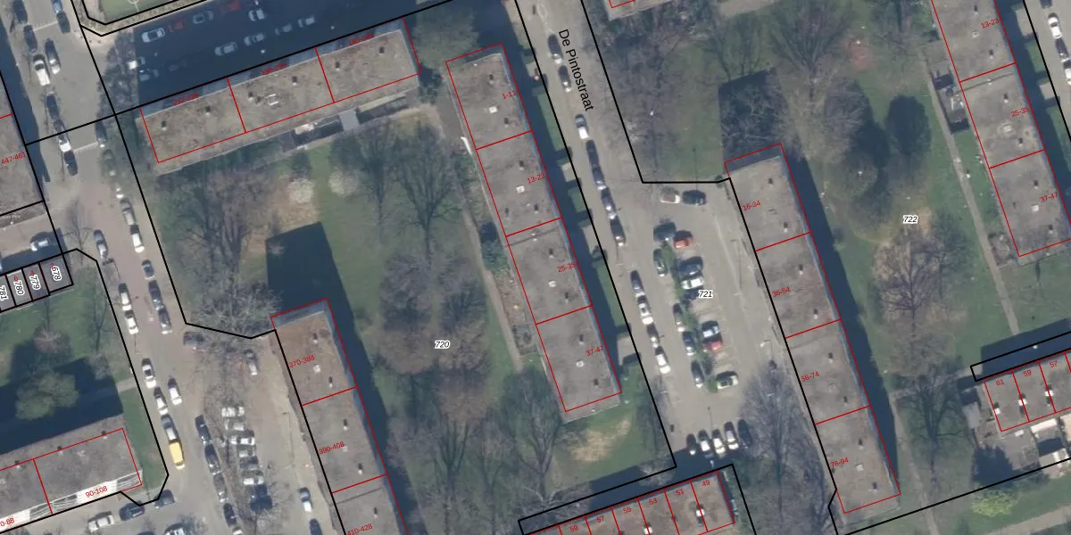 De Pintostraat 29 is gelegen op kadastraal perceel SBK01D720. Deze kadastrale aanduiding is uniek en wordt gebruikt door het Kadaster om eigendomsrechten en andere zakelijke rechten vast te leggen. Het perceel maakt onderdeel uit van de kadastrale gemeente Schiebroek.