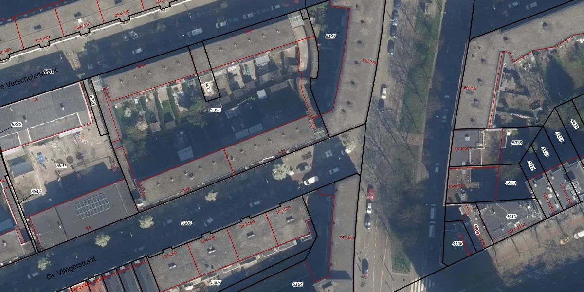 De Vliegerstraat 19 is gelegen op kadastraal perceel DHV00C5336. Deze kadastrale aanduiding is uniek en wordt gebruikt door het Kadaster om eigendomsrechten en andere zakelijke rechten vast te leggen. Het perceel maakt onderdeel uit van de kadastrale gemeente Delfshaven.