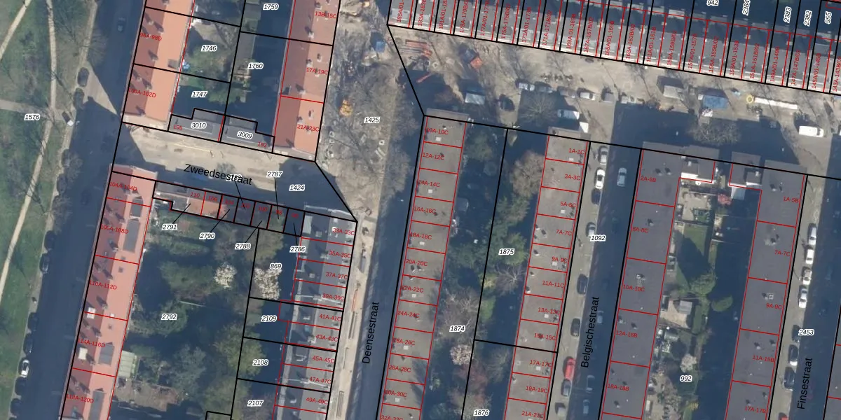 Het perceel waarop Deensestraat 16-A staat heeft een oppervlakte van 2015 m². Dit is een zeer groot perceel. De perceeloppervlakte wordt geregistreerd door het Kadaster. Gedetailleerde informatie over de maten van dit perceel kunt u vinden in het rapport Kadastrale kaart met maatvoering van Deensestraat 16-A.