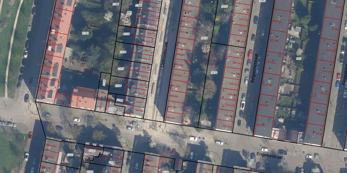 Het perceel waarop Deensestraat 34-A staat heeft een oppervlakte van 2015 m². Dit is een zeer groot perceel. De perceeloppervlakte wordt geregistreerd door het Kadaster. Gedetailleerde informatie over de maten van dit perceel kunt u vinden in het rapport Kadastrale kaart met maatvoering van Deensestraat 34-A.