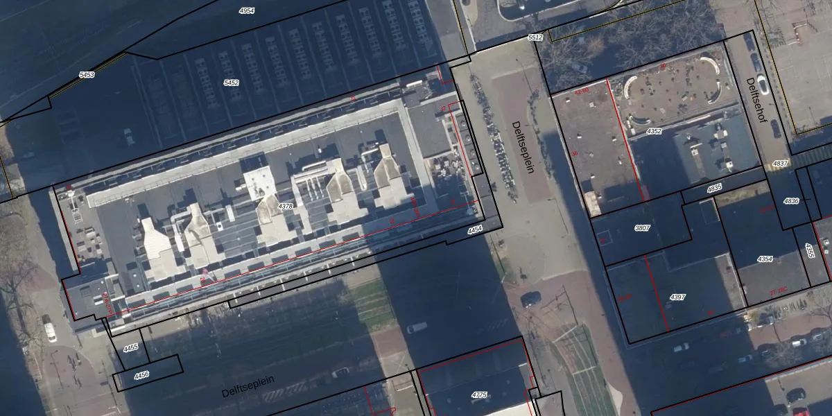 Het perceel waarop Delftseplein 30-B staat heeft een oppervlakte van 3895 m². Dit is een zeer groot perceel. De perceeloppervlakte wordt geregistreerd door het Kadaster. Gedetailleerde informatie over de maten van dit perceel kunt u vinden in het rapport Kadastrale kaart met maatvoering van Delftseplein 30-B.