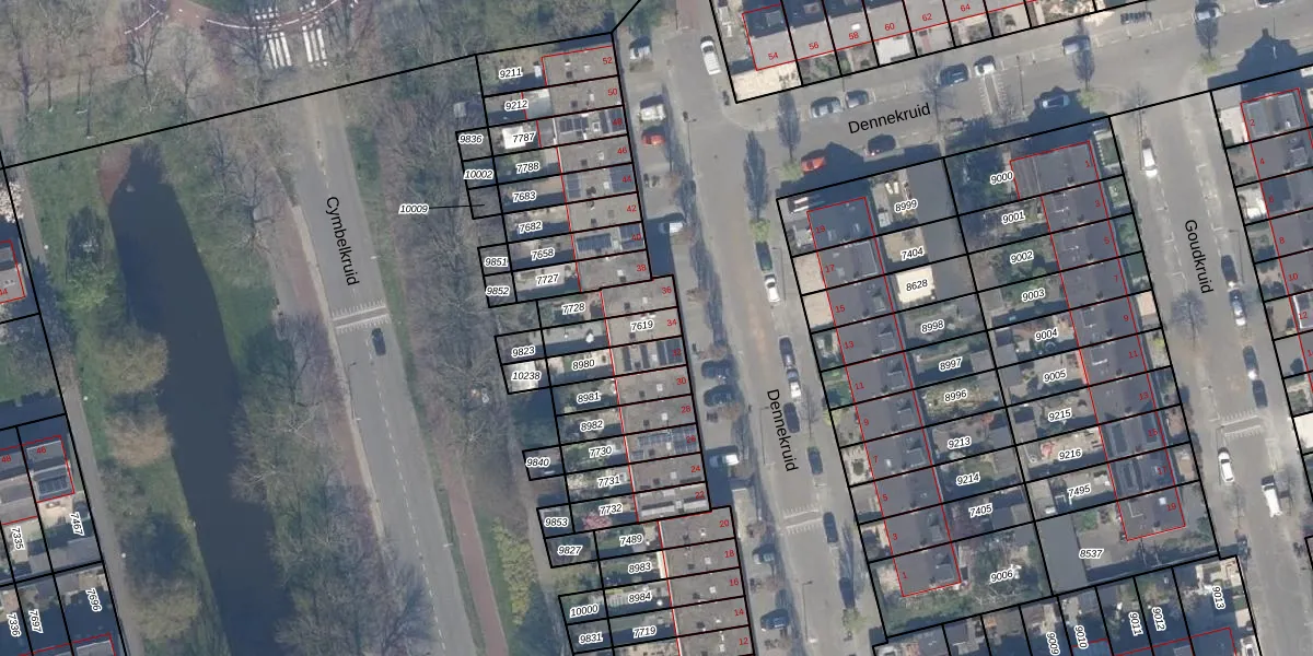 Het perceel waarop Dennekruid 34 staat heeft een oppervlakte van 94 m². Dit is een klein perceel. De perceeloppervlakte wordt geregistreerd door het Kadaster. Gedetailleerde informatie over de maten van dit perceel kunt u vinden in het rapport Kadastrale kaart met maatvoering van Dennekruid 34.