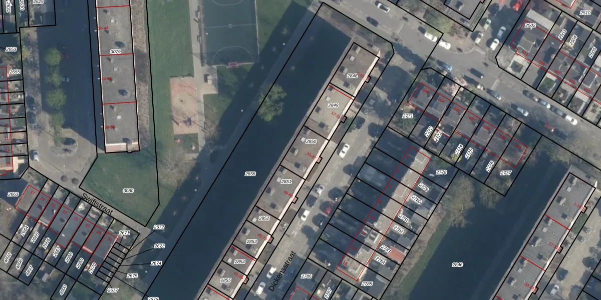 Dickensstraat 43 is gelegen op kadastraal perceel ISM01C2850. Deze kadastrale aanduiding is uniek en wordt gebruikt door het Kadaster om eigendomsrechten en andere zakelijke rechten vast te leggen. Het perceel maakt onderdeel uit van de kadastrale gemeente IJsselmonde.