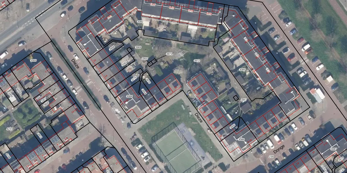 Het perceel waarop Dieze 38 staat heeft een oppervlakte van 2881 m². Dit is een zeer groot perceel. De perceeloppervlakte wordt geregistreerd door het Kadaster. Gedetailleerde informatie over de maten van dit perceel kunt u vinden in het rapport Kadastrale kaart met maatvoering van Dieze 38.