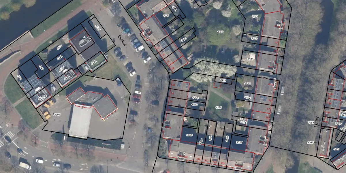 Het perceel waarop Dinkel 22 staat heeft een oppervlakte van 1078 m². Dit is een zeer groot perceel. De perceeloppervlakte wordt geregistreerd door het Kadaster. Gedetailleerde informatie over de maten van dit perceel kunt u vinden in het rapport Kadastrale kaart met maatvoering van Dinkel 22.