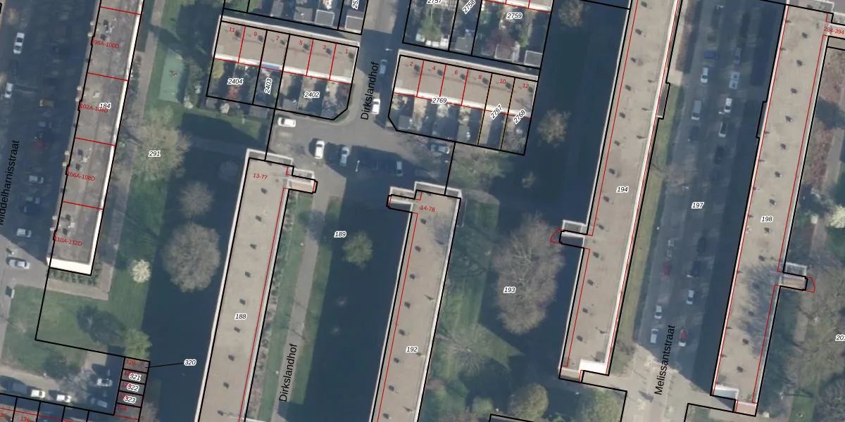 Dirkslandhof 54 is gelegen op kadastraal perceel CLS00L192. Deze kadastrale aanduiding is uniek en wordt gebruikt door het Kadaster om eigendomsrechten en andere zakelijke rechten vast te leggen. Het perceel maakt onderdeel uit van de kadastrale gemeente Charlois.
