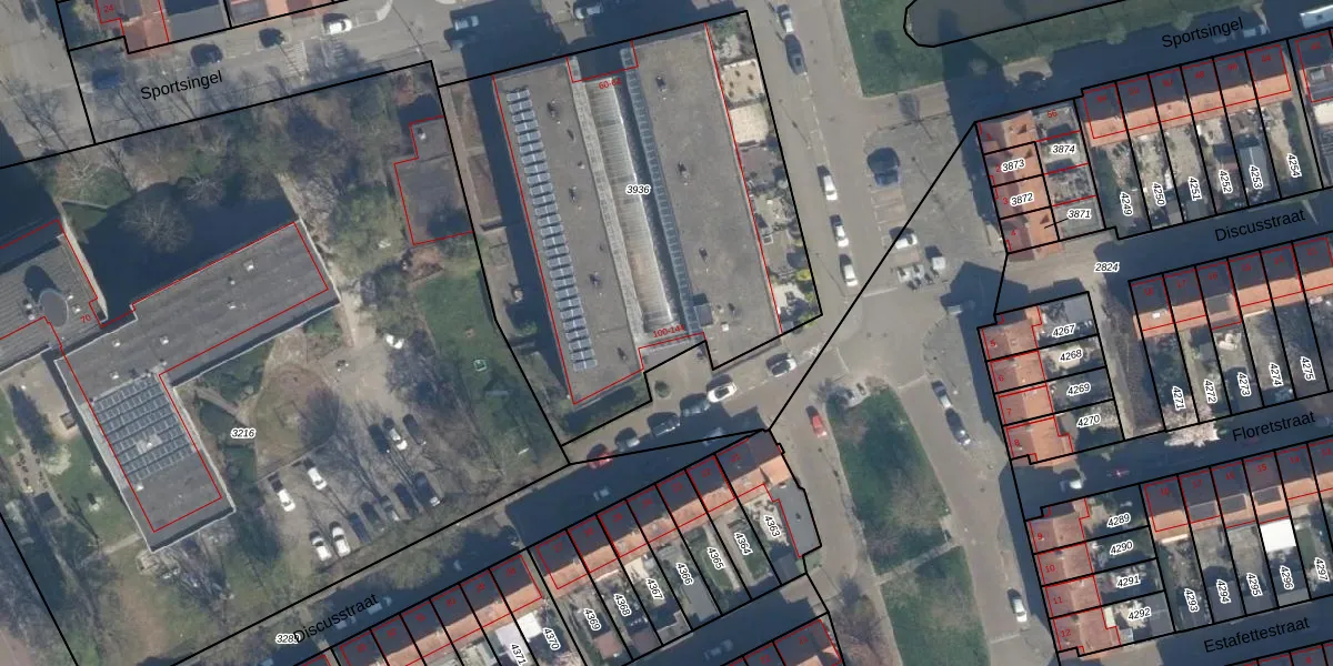 Het perceel waarop Discusstraat 105 staat heeft een oppervlakte van 2400 m². Dit is een zeer groot perceel. De perceeloppervlakte wordt geregistreerd door het Kadaster. Gedetailleerde informatie over de maten van dit perceel kunt u vinden in het rapport Kadastrale kaart met maatvoering van Discusstraat 105.