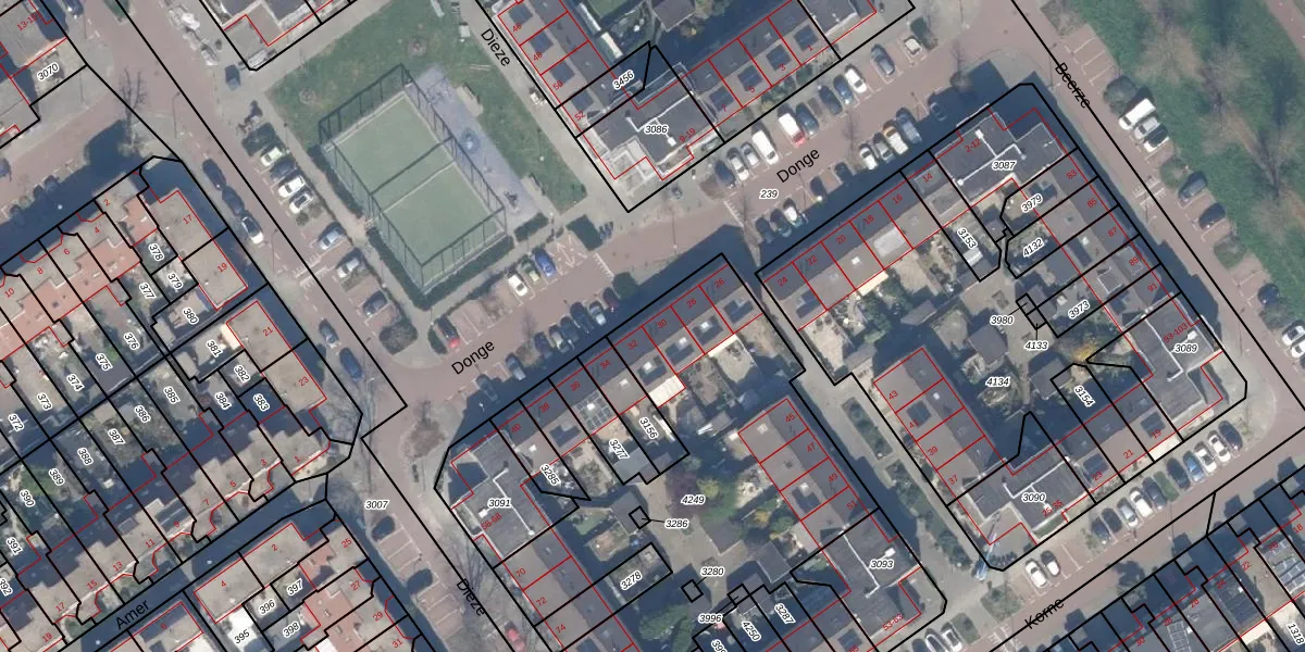 Het perceel waarop Donge 30 staat heeft een oppervlakte van 1983 m². Dit is een zeer groot perceel. De perceeloppervlakte wordt geregistreerd door het Kadaster. Gedetailleerde informatie over de maten van dit perceel kunt u vinden in het rapport Kadastrale kaart met maatvoering van Donge 30.