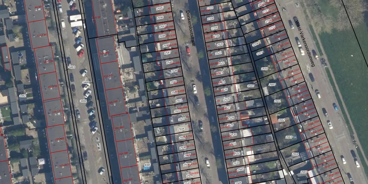 Donkerslootstraat 65-B is gelegen op kadastraal perceel RTD05V2500. Deze kadastrale aanduiding is uniek en wordt gebruikt door het Kadaster om eigendomsrechten en andere zakelijke rechten vast te leggen. Het perceel maakt onderdeel uit van de kadastrale gemeente Rotterdam.