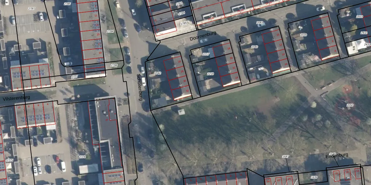 Doornenburg 32 is gelegen op kadastraal perceel CLS00K2042. Deze kadastrale aanduiding is uniek en wordt gebruikt door het Kadaster om eigendomsrechten en andere zakelijke rechten vast te leggen. Het perceel maakt onderdeel uit van de kadastrale gemeente Charlois.