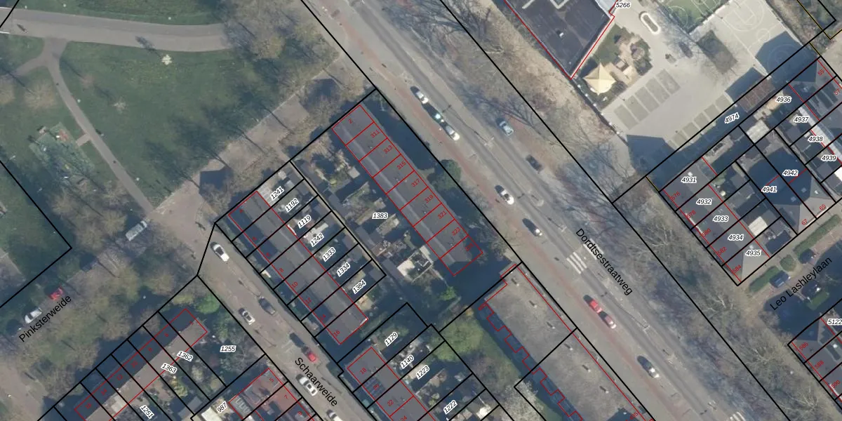 Het perceel waarop Dordtsestraatweg 319 staat heeft een oppervlakte van 1628 m². Dit is een zeer groot perceel. De perceeloppervlakte wordt geregistreerd door het Kadaster. Gedetailleerde informatie over de maten van dit perceel kunt u vinden in het rapport Kadastrale kaart met maatvoering van Dordtsestraatweg 319.