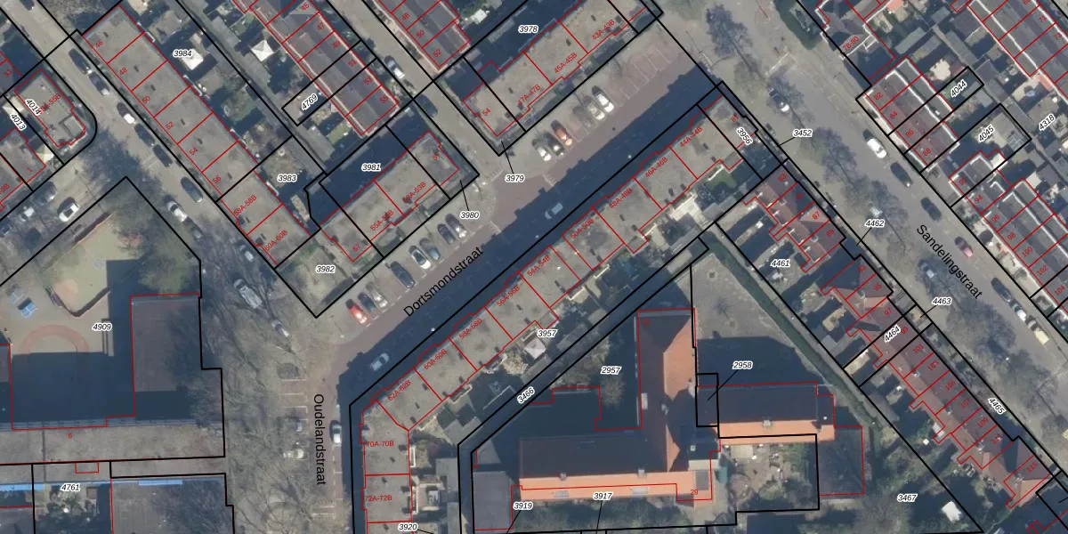 Het perceel waarop Dortsmondstraat 54-B staat heeft een oppervlakte van 2257 m². Dit is een zeer groot perceel. De perceeloppervlakte wordt geregistreerd door het Kadaster. Gedetailleerde informatie over de maten van dit perceel kunt u vinden in het rapport Kadastrale kaart met maatvoering van Dortsmondstraat 54-B.