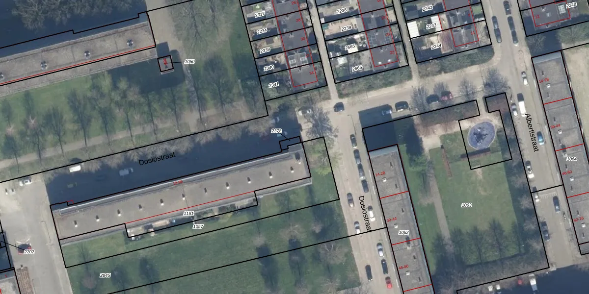Het perceel waarop Dosiostraat 39 staat heeft een oppervlakte van 1185 m². Dit is een zeer groot perceel. De perceeloppervlakte wordt geregistreerd door het Kadaster. Gedetailleerde informatie over de maten van dit perceel kunt u vinden in het rapport Kadastrale kaart met maatvoering van Dosiostraat 39.