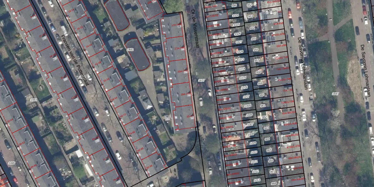 Dr. de Visserstraat 31-A is gelegen op kadastraal perceel RTD10AB1442. Deze kadastrale aanduiding is uniek en wordt gebruikt door het Kadaster om eigendomsrechten en andere zakelijke rechten vast te leggen. Het perceel maakt onderdeel uit van de kadastrale gemeente Rotterdam.