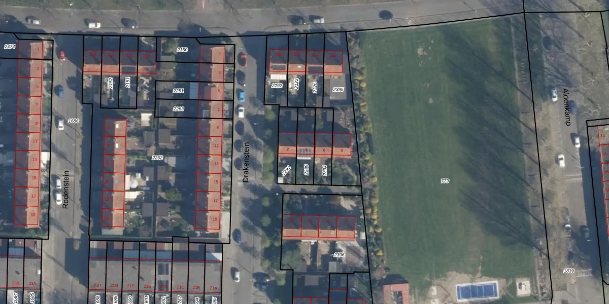 Gebruik de zoekbalk of klik op een perceel voor informatie over de adressen binnen dit perceel.
