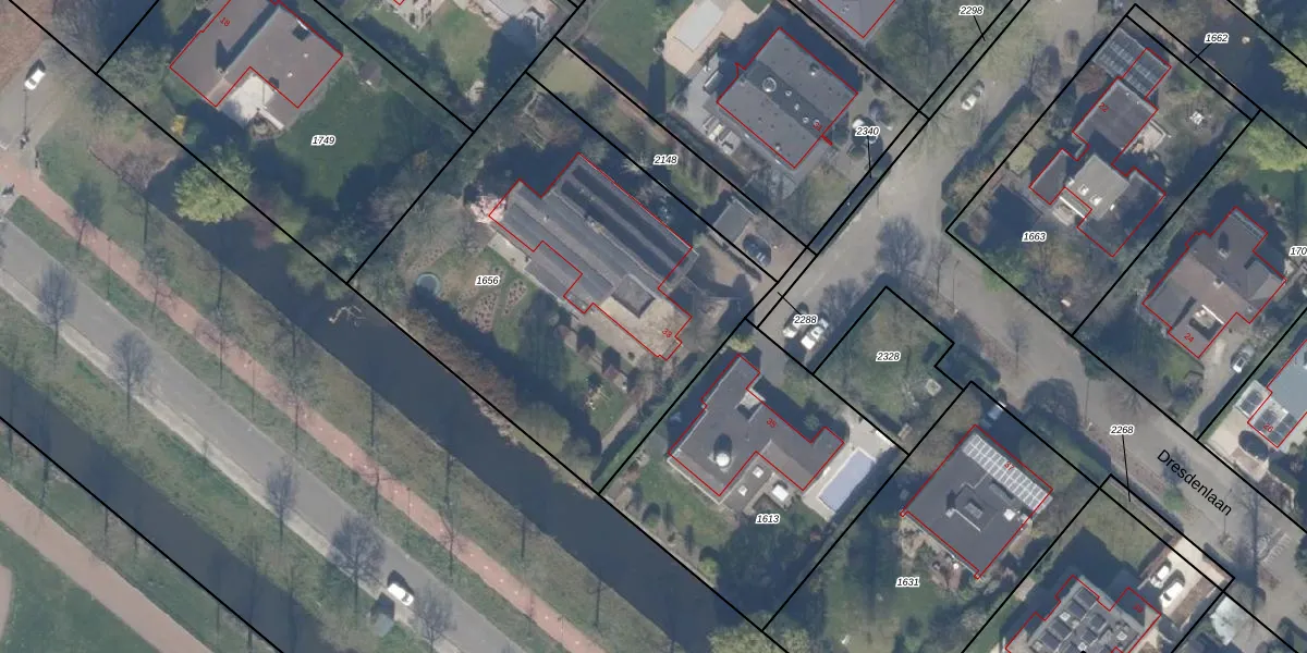 Het perceel waarop Dresdenlaan 33 staat heeft een oppervlakte van 2150 m². Dit is een zeer groot perceel. De perceeloppervlakte wordt geregistreerd door het Kadaster. Gedetailleerde informatie over de maten van dit perceel kunt u vinden in het rapport Kadastrale kaart met maatvoering van Dresdenlaan 33.
