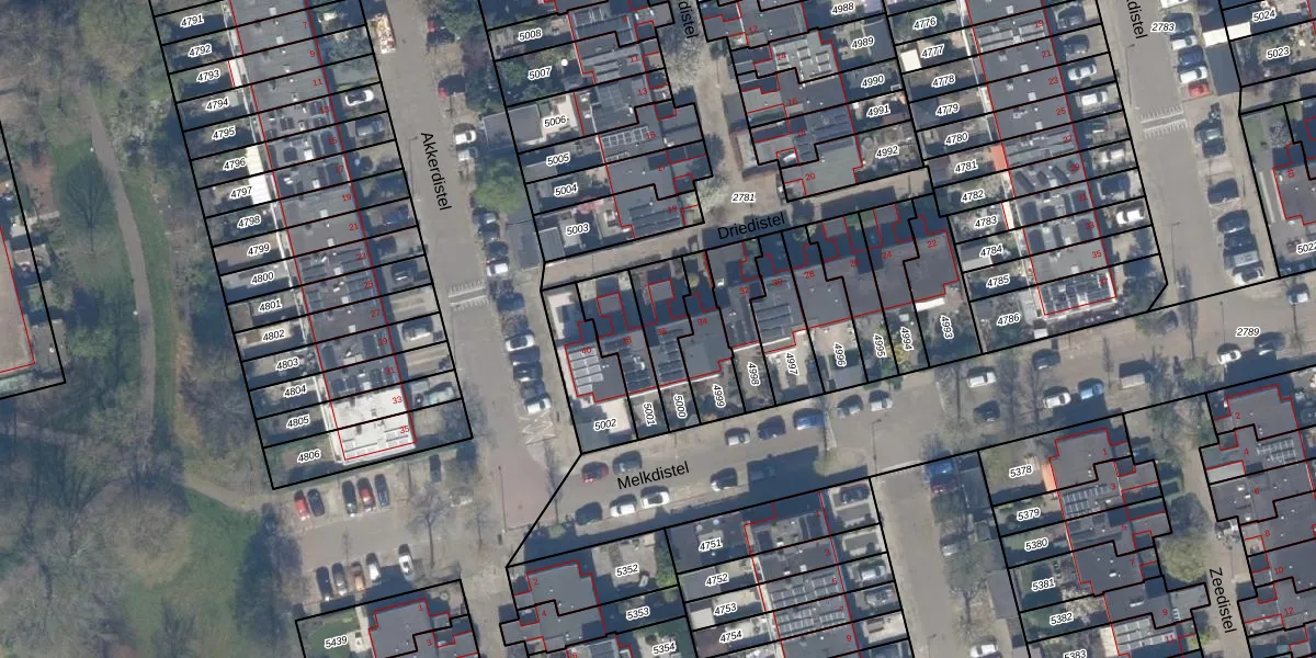 Het perceel waarop Driedistel 36 staat heeft een oppervlakte van 165 m². Dit is een middelgroot perceel. De perceeloppervlakte wordt geregistreerd door het Kadaster. Gedetailleerde informatie over de maten van dit perceel kunt u vinden in het rapport Kadastrale kaart met maatvoering van Driedistel 36.