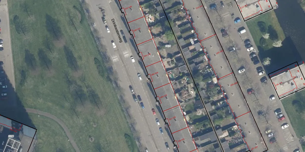 Drinkwaterweg 182 is gelegen op kadastraal perceel KLG00E2173. Deze kadastrale aanduiding is uniek en wordt gebruikt door het Kadaster om eigendomsrechten en andere zakelijke rechten vast te leggen. Het perceel maakt onderdeel uit van de kadastrale gemeente Kralingen.