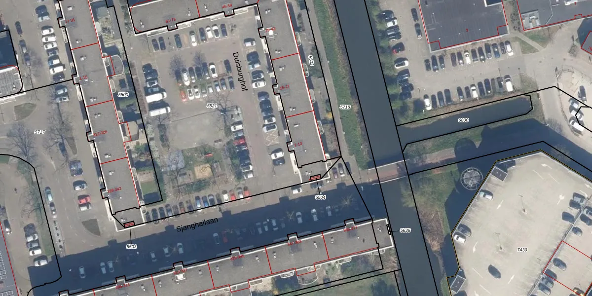 Het perceel waarop Duisburghof 5 staat heeft een oppervlakte van 1815 m². Dit is een zeer groot perceel. De perceeloppervlakte wordt geregistreerd door het Kadaster. Gedetailleerde informatie over de maten van dit perceel kunt u vinden in het rapport Kadastrale kaart met maatvoering van Duisburghof 5.