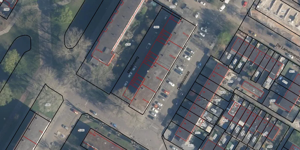 Het perceel waarop Dumasstraat 233 staat heeft een oppervlakte van 1752 m². Dit is een zeer groot perceel. De perceeloppervlakte wordt geregistreerd door het Kadaster. Gedetailleerde informatie over de maten van dit perceel kunt u vinden in het rapport Kadastrale kaart met maatvoering van Dumasstraat 233.