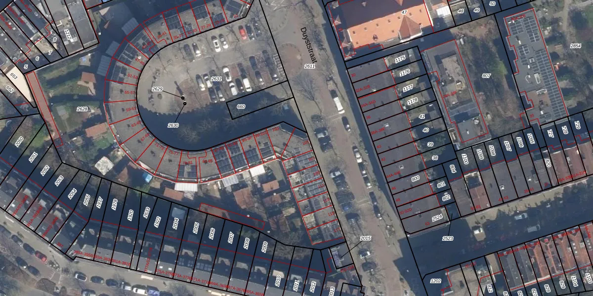 Het perceel waarop Duyststraat 105 staat heeft een oppervlakte van 5163 m². Dit is een zeer groot perceel. De perceeloppervlakte wordt geregistreerd door het Kadaster. Gedetailleerde informatie over de maten van dit perceel kunt u vinden in het rapport Kadastrale kaart met maatvoering van Duyststraat 105.