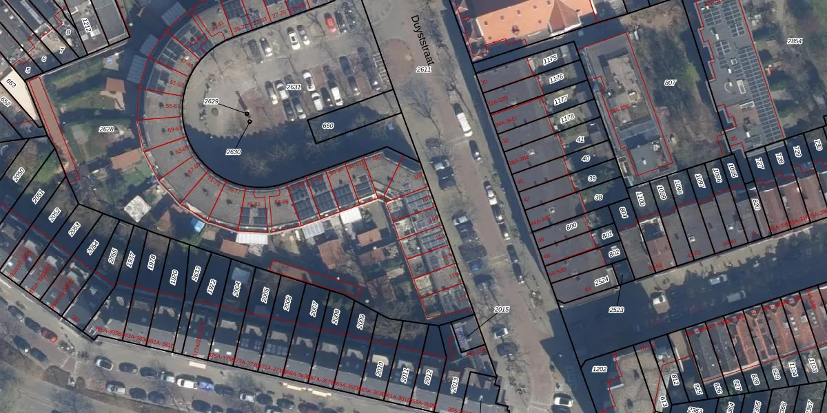 Het perceel waarop Duyststraat 107 staat heeft een oppervlakte van 5163 m². Dit is een zeer groot perceel. De perceeloppervlakte wordt geregistreerd door het Kadaster. Gedetailleerde informatie over de maten van dit perceel kunt u vinden in het rapport Kadastrale kaart met maatvoering van Duyststraat 107.