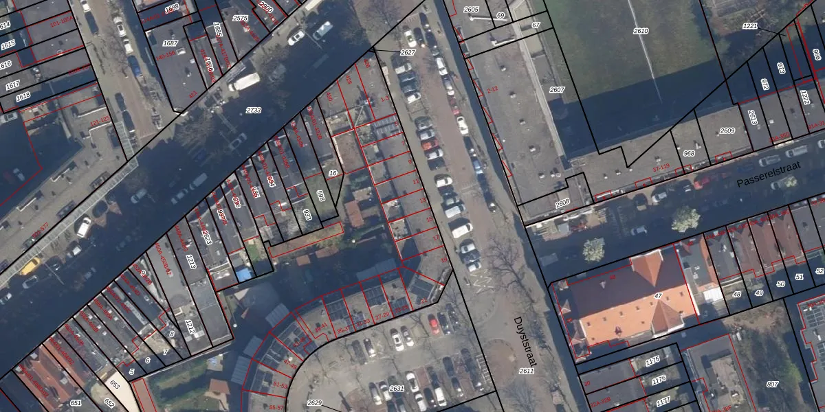 Het perceel waarop Duyststraat 13 staat heeft een oppervlakte van 5163 m². Dit is een zeer groot perceel. De perceeloppervlakte wordt geregistreerd door het Kadaster. Gedetailleerde informatie over de maten van dit perceel kunt u vinden in het rapport Kadastrale kaart met maatvoering van Duyststraat 13.