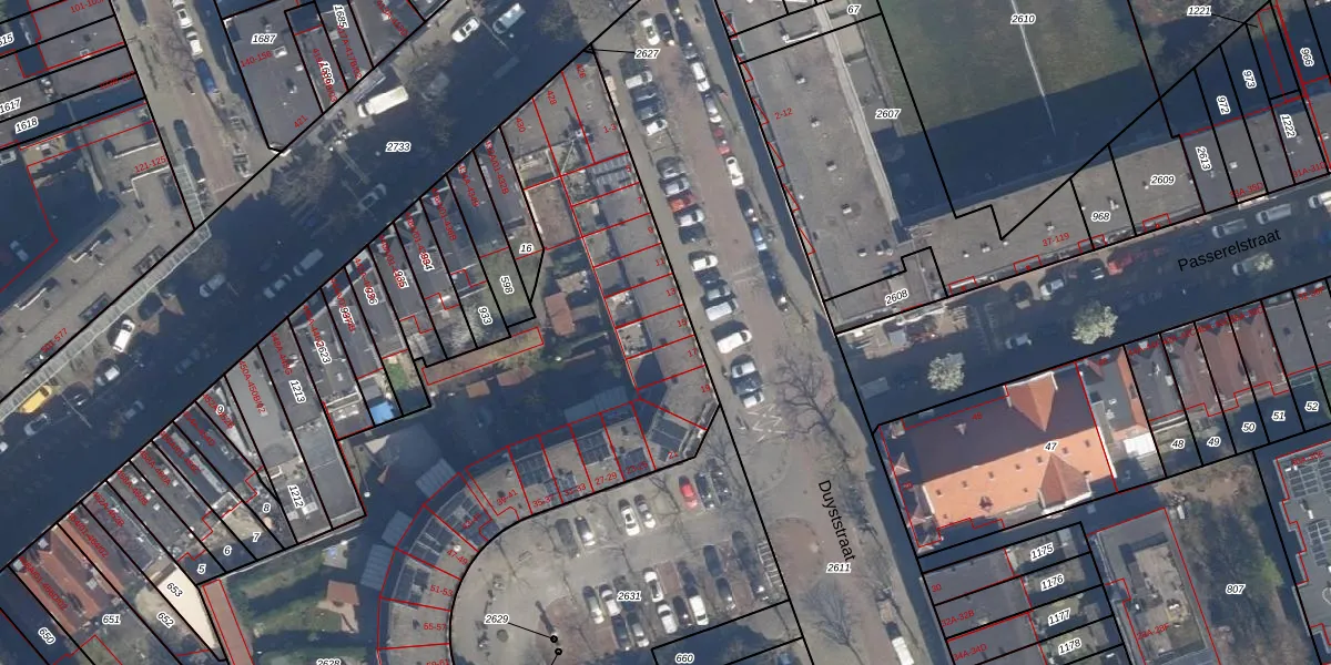 Het perceel waarop Duyststraat 15 staat heeft een oppervlakte van 5163 m². Dit is een zeer groot perceel. De perceeloppervlakte wordt geregistreerd door het Kadaster. Gedetailleerde informatie over de maten van dit perceel kunt u vinden in het rapport Kadastrale kaart met maatvoering van Duyststraat 15.