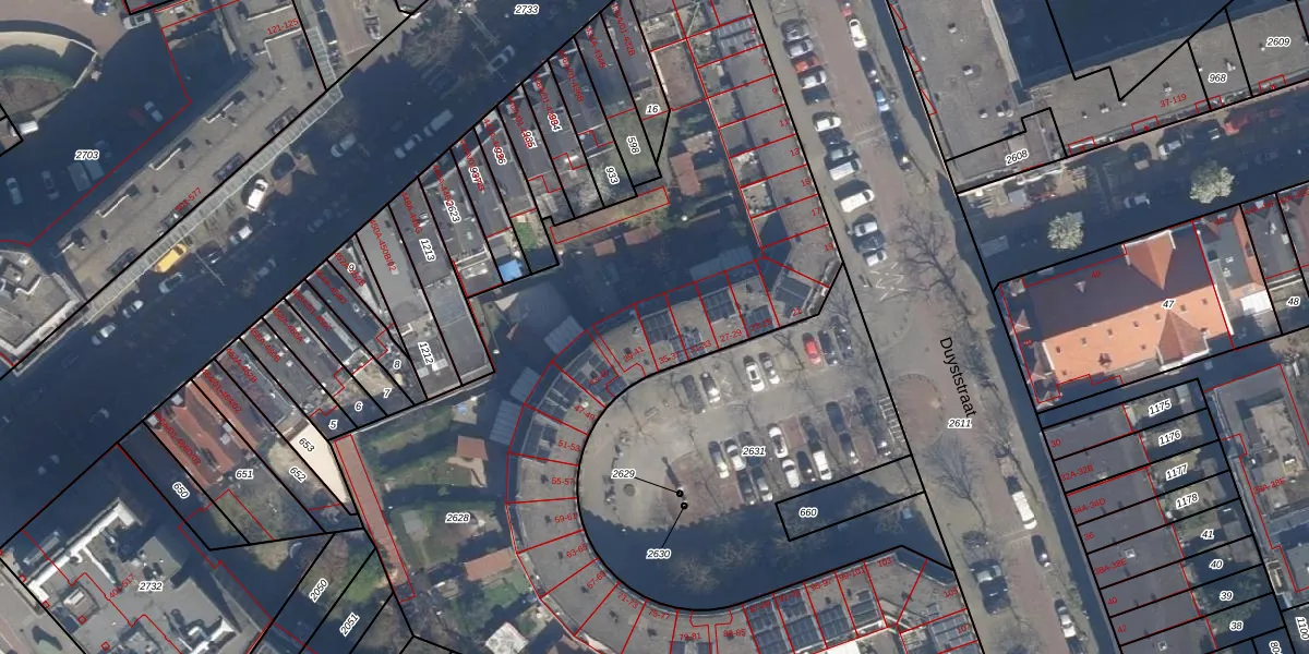 Het perceel waarop Duyststraat 35 staat heeft een oppervlakte van 5163 m². Dit is een zeer groot perceel. De perceeloppervlakte wordt geregistreerd door het Kadaster. Gedetailleerde informatie over de maten van dit perceel kunt u vinden in het rapport Kadastrale kaart met maatvoering van Duyststraat 35.