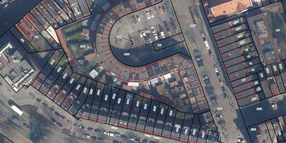 Het perceel waarop Duyststraat 85 staat heeft een oppervlakte van 5163 m². Dit is een zeer groot perceel. De perceeloppervlakte wordt geregistreerd door het Kadaster. Gedetailleerde informatie over de maten van dit perceel kunt u vinden in het rapport Kadastrale kaart met maatvoering van Duyststraat 85.