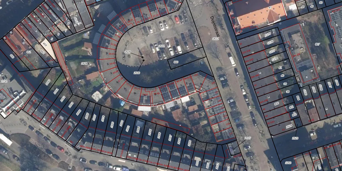 Het perceel waarop Duyststraat 91 staat heeft een oppervlakte van 5163 m². Dit is een zeer groot perceel. De perceeloppervlakte wordt geregistreerd door het Kadaster. Gedetailleerde informatie over de maten van dit perceel kunt u vinden in het rapport Kadastrale kaart met maatvoering van Duyststraat 91.