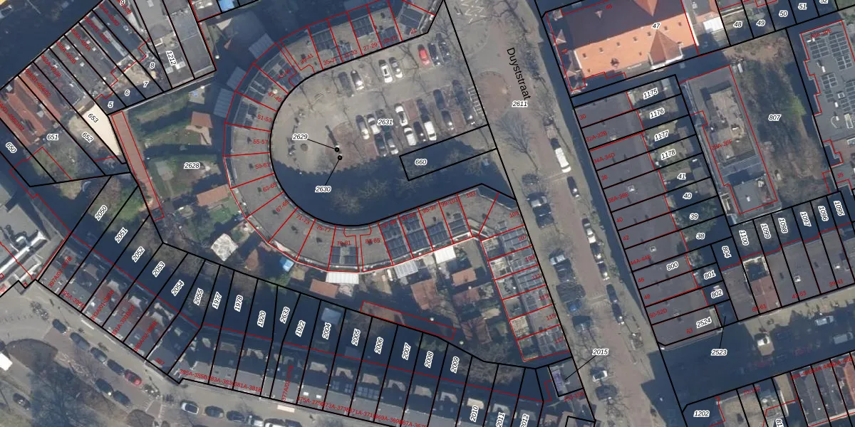 Het perceel waarop Duyststraat 97 staat heeft een oppervlakte van 5163 m². Dit is een zeer groot perceel. De perceeloppervlakte wordt geregistreerd door het Kadaster. Gedetailleerde informatie over de maten van dit perceel kunt u vinden in het rapport Kadastrale kaart met maatvoering van Duyststraat 97.