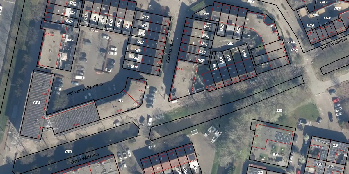 Het perceel waarop Eckartstraat 48 staat heeft een oppervlakte van 1206 m². Dit is een zeer groot perceel. De perceeloppervlakte wordt geregistreerd door het Kadaster. Gedetailleerde informatie over de maten van dit perceel kunt u vinden in het rapport Kadastrale kaart met maatvoering van Eckartstraat 48.