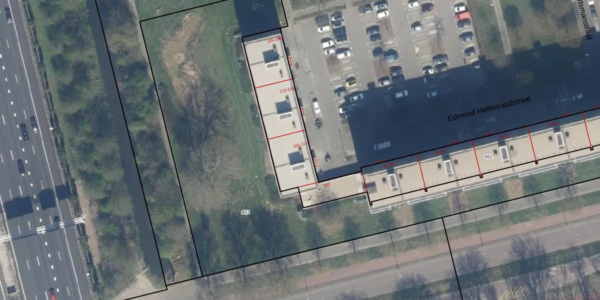 Het perceel waarop Edmond Hellenraadstraat 111 staat heeft een oppervlakte van 2221 m². Dit is een zeer groot perceel. De perceeloppervlakte wordt geregistreerd door het Kadaster. Gedetailleerde informatie over de maten van dit perceel kunt u vinden in het rapport Kadastrale kaart met maatvoering van Edmond Hellenraadstraat 111.