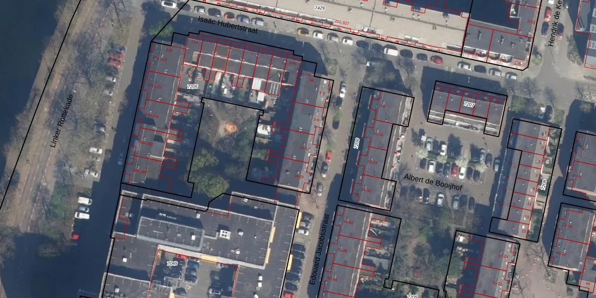 Het perceel waarop het adres ligt is RTD07-R-7205. De afkorting 'RTD07' staat voor kadastrale gemeente Rotterdam. Het perceel is met 2520 m² relatief groot. Het gemiddelde ligt in de kadastrale gemeente Rotterdam op 506,86 m². Het grootste perceel in de kadastrale gemeente is 10,8 ha. Het kleinste perceel heeft een oppervlakte van 0 m². Op het perceel liggen in totaal 40 adressen. De huidige grenzen van het perceel zijn digitaal in de Basisregistratie Kadaster (BRK) geregistreerd op 28-06-2004.