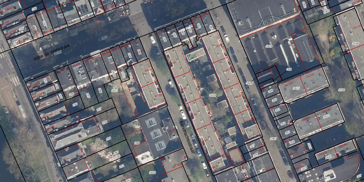 Eendrachtsstraat 38 is gelegen op kadastraal perceel RTD04AG1614. Deze kadastrale aanduiding is uniek en wordt gebruikt door het Kadaster om eigendomsrechten en andere zakelijke rechten vast te leggen. Het perceel maakt onderdeel uit van de kadastrale gemeente Rotterdam.